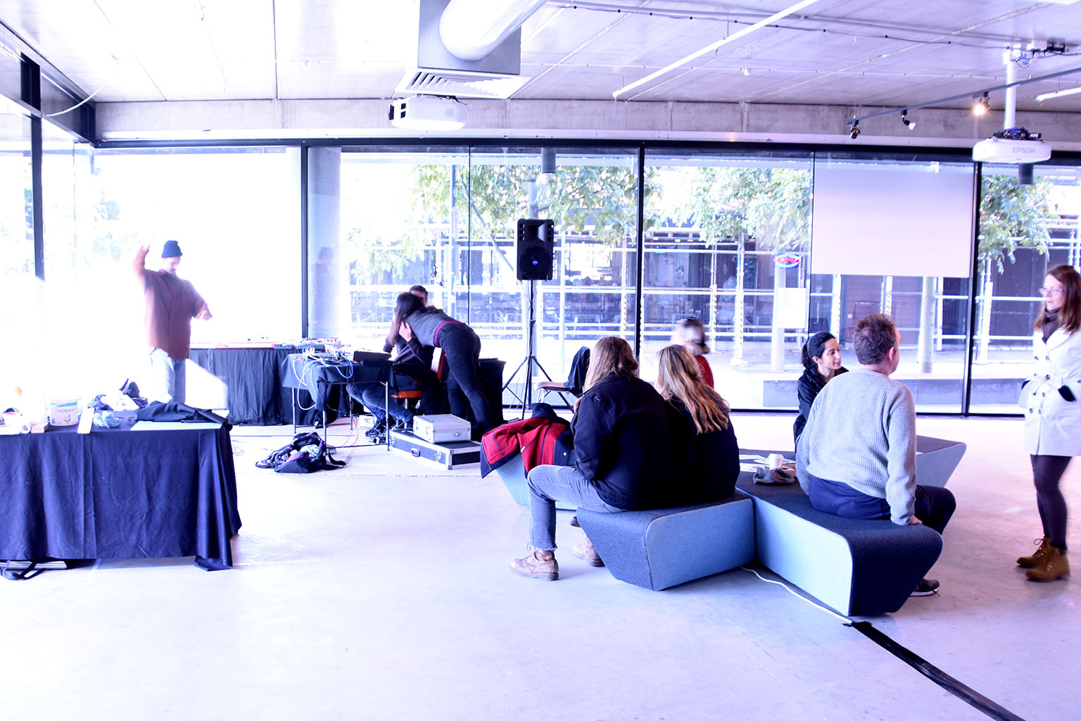 This is Not a Drill Collective on Saturday 7th July 2018 featuring electronic musicians and audience in the gallery alongside projects from visual artists and performers, and Telematic Cafe.