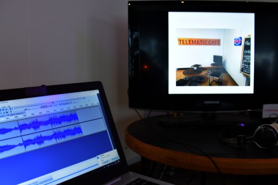 Gallery view of Telematic Cafe showing the sound file (on PC) produced from social media images (on screen).