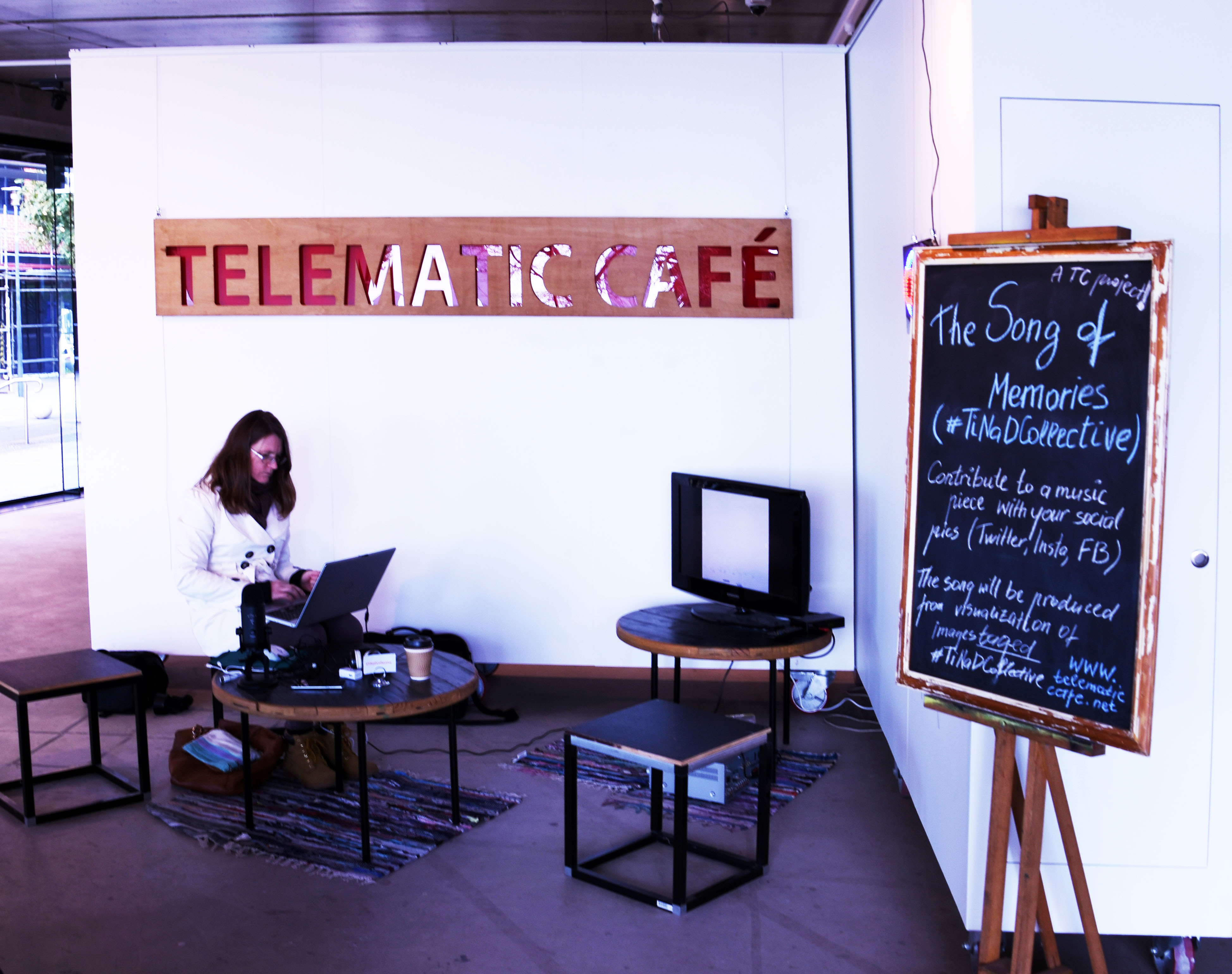 In the gallery, Telematic Café reorganizes perspectives: a historic Telematic Café time lapse plays in the first days; in the second week – the retrieved social media pictures of #TiNaDCollective are replayed back on the screen. The photos telematically resonate in social media and develop new encounters/ perspectives, these develop a spiraling course through interfaces – gallery, mobile, screen. If one is to handle data objects and archives, then second order cybernetics must be at work – the observing subject is part of the observed system, new contexts are added and fed back, as in Rossiter’s processual aesthetics. In accord with the event’s disclaimer “this is not a drill” the The Song of Memories evolves at Telematic Café running process and wanting to come to some relation between visualization and reality conditions.